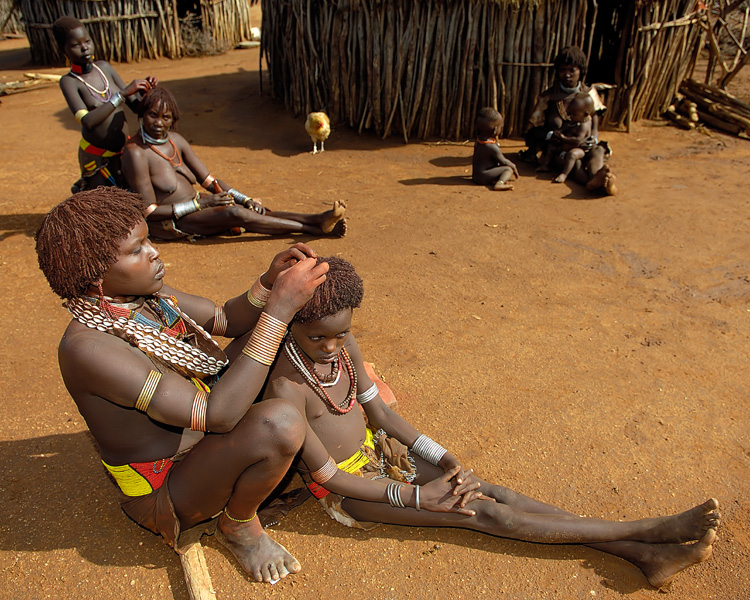 - Hair dressing in the courtyard of a village